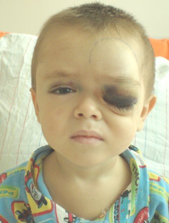 Все началось с того, что опух левый глаз. Мы ребенка обратилась в больницу и ДИМА попал в глазное отделение. Начали лечение, но после введения промывок (натрий хлор и глюкоза) опухоль начала быстро расти. Она выдавливала левый глазик, и он закрылся, на нем появилась большая ярко выраженная гематома.