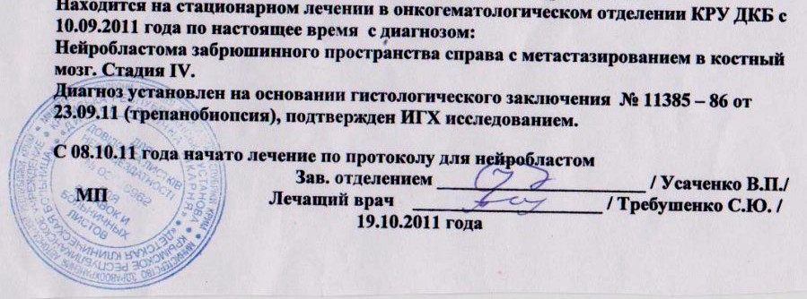 Когда мальчик попал в онкологию, все анализы показывали сильное отравление организма продуктами опухоли. Сделали биопсию, и выяснилось, что у ДИМЫ полностью поражен костный мозг. В больнице начал опухать и правый глаз. Опухоль очень быстро распространялась, после полного обследования ДИМИ поставили диагноз – нейробластома забрюшинного пространства с метастазированием в костный мозг 4 стадии.